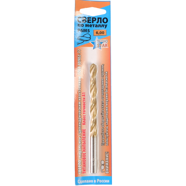 Сверло по металлу 6,00мм цил.хв. титан. ГОСТ10902А1 Р6М5-ШБ
