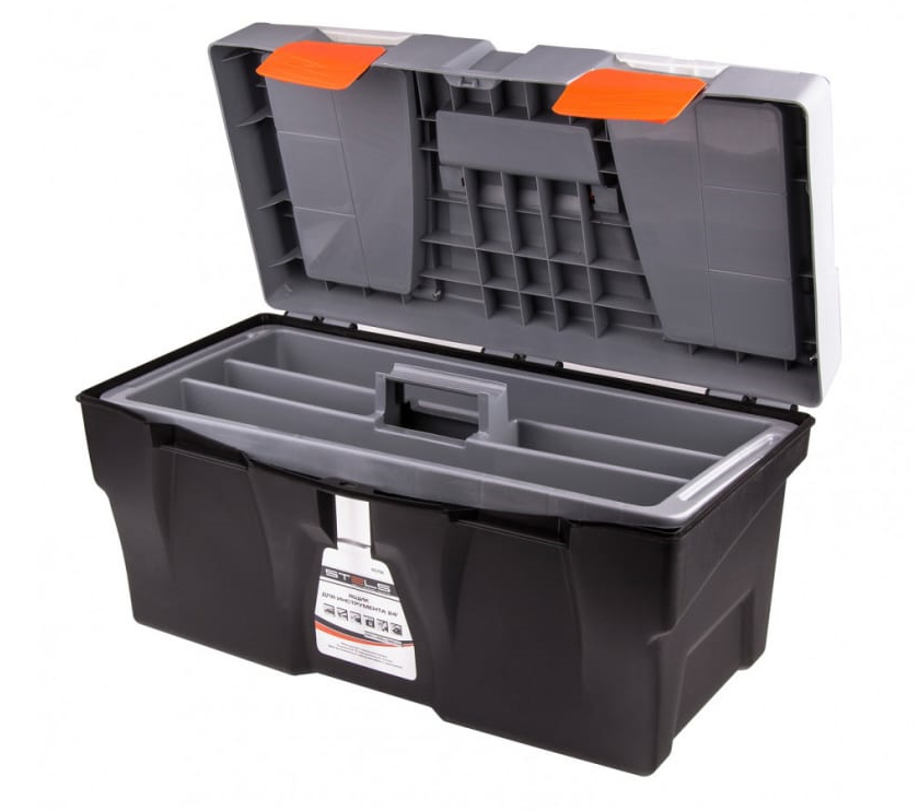 Ящик для инструмента Stels 90706, 24 дюймов, габаритами 590 х 300 х 300 мм, из пластика, предназначен для переноски и хранения инструментов, хозяйственных мелочей, рыболовных снастей. Содержимое не рассыпется, поскольку он надежно закрывается. Встроенные в крышку отделения обеспечивают быстрый доступ к крепежам и другим необходимым предметам. Большой ящик для хранения инструментов будет полезен дома, на даче, в гараже и на рыбалке.